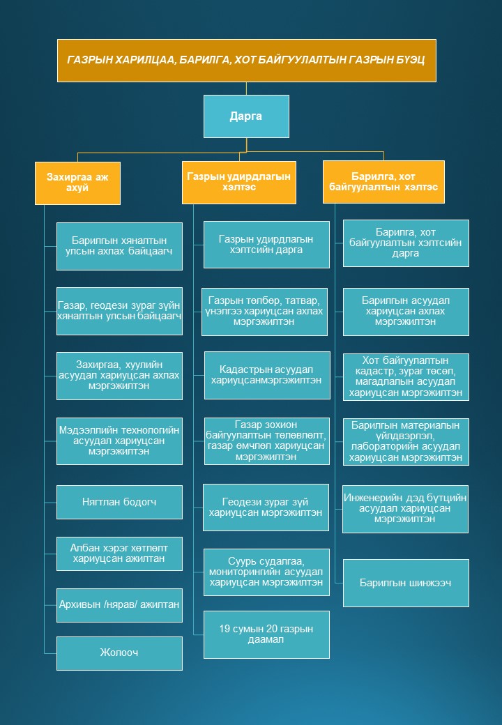 Газрын харилцаа, барилга, хот байгуулалтын газар нь Барилга, хот байгуулалтын хэлтэс, Газрын удирдлагын хэлтэс, Захиргаа аж ахуй гэсэн 3-н хэсэгтэйгээр, төрийн захиргааны албан хаагч 35, төрийн үйлчилгээний ажилтан 5, Гэрээт ажилтан-1 бүгд 41 хүний бүрэлдэхүүнтэйгээр үйл ажиллагаагаа явуулж байна.